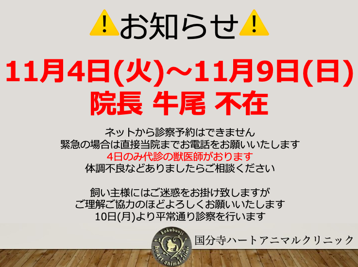 11月4日(火)~11月9日(日)は院長 牛尾が不在となります