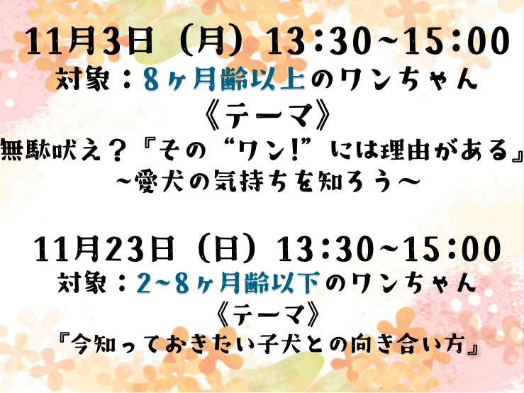 11月3日(月)13:30~15:00 8ヶ月以上のわんちゃん対象