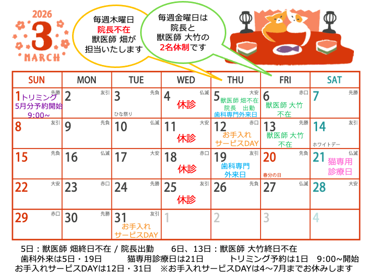 3月5日(木)は獣医師 畑終日休診、院長出勤