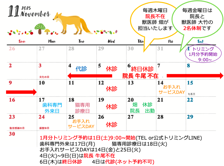 11月20日(木)は獣医師 畑が終日休診、院長 牛尾が対応いたします